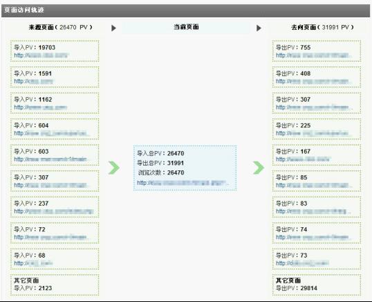 訪客經(jīng)常在網(wǎng)站中的各個(gè)頁面之間跳轉(zhuǎn),訪問的路徑不勝枚舉,但可以通過觀察焦點(diǎn)頁面及其上下游頁面,掌握訪客的來路和去向,發(fā)現(xiàn)較普遍的訪客訪問習(xí)慣。頁面訪問軌跡即用來完成該功能,用戶可自由指定觀察焦點(diǎn)頁面,系統(tǒng)會(huì)列出該頁面的前十位來路頁面和去向頁面。對(duì)觀察焦點(diǎn)頁面而言,其自身的導(dǎo)入、導(dǎo)出PV的多少能夠反映出該頁面在網(wǎng)站的權(quán)重地位,而通過觀察來源和去向頁面又能最大限度的了解到訪客的行為習(xí)慣及興趣點(diǎn)。