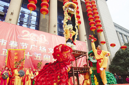 作為2013年蚌埠市春節(jié)廣場文化活動的壓軸大戲,整場演出共有來自禹會區(qū)文化館、蚌山區(qū)文化館和龍子湖區(qū)文化館的8支花鼓燈表演隊先后登臺獻(xiàn)藝,一個小時的演出吸引了上千名市民駐足觀看。據(jù)市文廣新局負(fù)責(zé)人介紹,這8支花鼓燈隊伍從全市一百多支花鼓燈藝術(shù)團(tuán)中脫穎而出,聚集在科學(xué)宮廣場上表演,為市民送上元宵節(jié)藝術(shù)大餐。