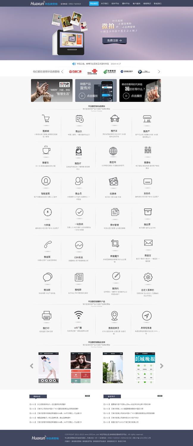 華迅網(wǎng)絡(luò)是打造一個(gè)專門針對(duì)微信公眾賬號(hào)提供營(yíng)銷推廣服務(wù)的第三方平臺(tái)。主要功能是針對(duì)微信商家公眾號(hào)提供與眾不同的、有針對(duì)性的營(yíng)銷推廣服務(wù)。通過(guò)華訊微網(wǎng)站平臺(tái),用戶可以輕松管理自己的微信各類信息,對(duì)微信公眾賬號(hào)進(jìn)行維護(hù)、開展智能機(jī)器人、在線發(fā)優(yōu)惠劵、抽獎(jiǎng)、刮獎(jiǎng)、派發(fā)會(huì)員卡、打造微官網(wǎng)、開啟微團(tuán)購(gòu)等多種活動(dòng),對(duì)微信營(yíng)銷實(shí)現(xiàn)有效監(jiān)控,極大擴(kuò)展?jié)撛诳蛻羧汉蛯?shí)現(xiàn)企業(yè)的運(yùn)營(yíng)目標(biāo)。華迅微網(wǎng)站平臺(tái)很好的彌補(bǔ)了微信公眾平臺(tái)本身功能不足、針對(duì)性不強(qiáng)、交互不便利的問(wèn)題,為商家公眾賬號(hào)提供更為貼心的、且是核心需求的功能和服務(wù)。在線優(yōu)惠劵、轉(zhuǎn)盤抽獎(jiǎng)、微信會(huì)員卡等推廣服務(wù)更是讓微信成為商家推廣的利器。智能客服的可調(diào)教功能讓用戶真正從微信繁瑣的日?头ぷ髦薪饷摮鰜(lái),真正成為商家便利的新營(yíng)銷渠道。