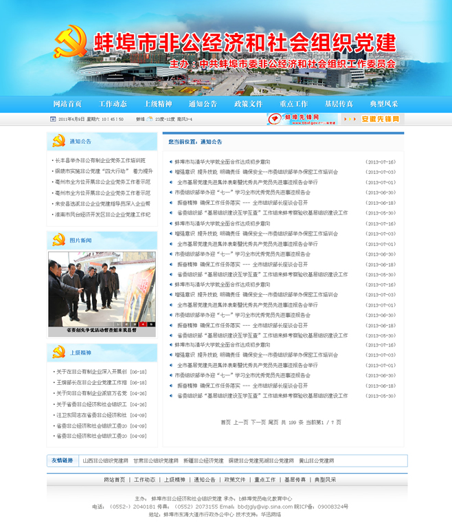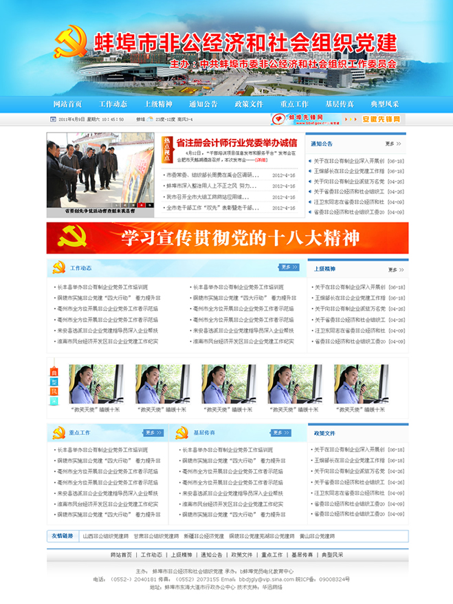網(wǎng)頁由中共蚌埠市委非公經(jīng)濟(jì)和社會組織工作委員會,蚌埠先鋒網(wǎng)電教中心承辦,作為蚌埠先鋒網(wǎng)子欄目,主要用于蚌埠非公經(jīng)濟(jì)和社會組織黨建工作有關(guān)信息發(fā)布和經(jīng)驗(yàn)交流。